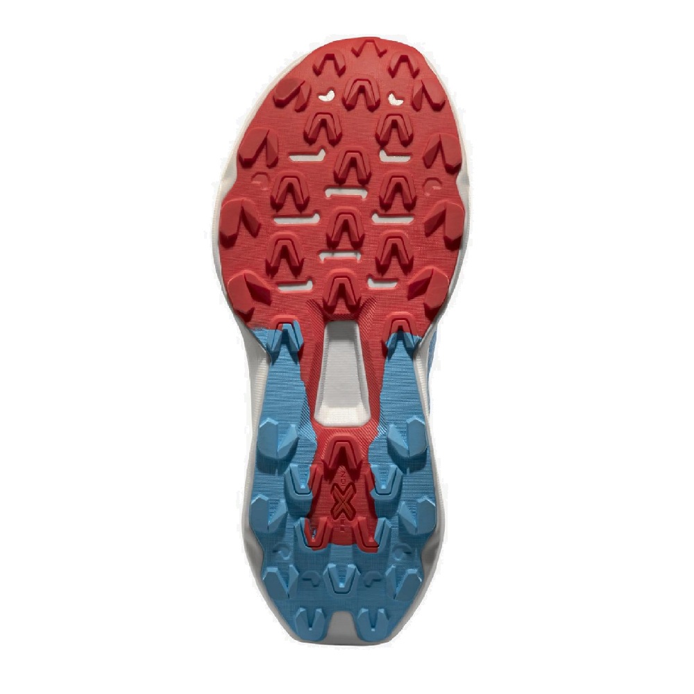 Ensuite, la semelle extérieure bi-densité FriXion® Red offre une adhérence remarquable sur les surfaces sèches ou mouillées. La gomme augmente la durabilité au niveau du talon tout en maximisant la traction à l’avant-pied. Par ailleurs, des crampons de 4 mm mordent le sol pour assurer une propulsion efficace en montée comme en descente. Le design renforcé du talon améliore considérablement le contrôle de la cheville lors des passages techniques.